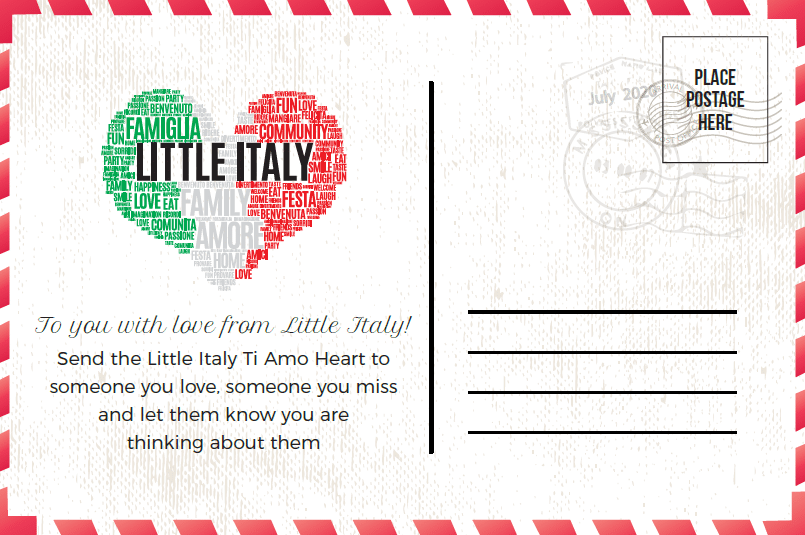 We’ve also made it a lot simpler to share the heart of Little Italy! You’ve probably seen this heart decorating the streets of Little Italy, the storefronts, and our social media channel. Now you can download your own copy of the heart and postcard! Share them online or print them out and place it in your window!
